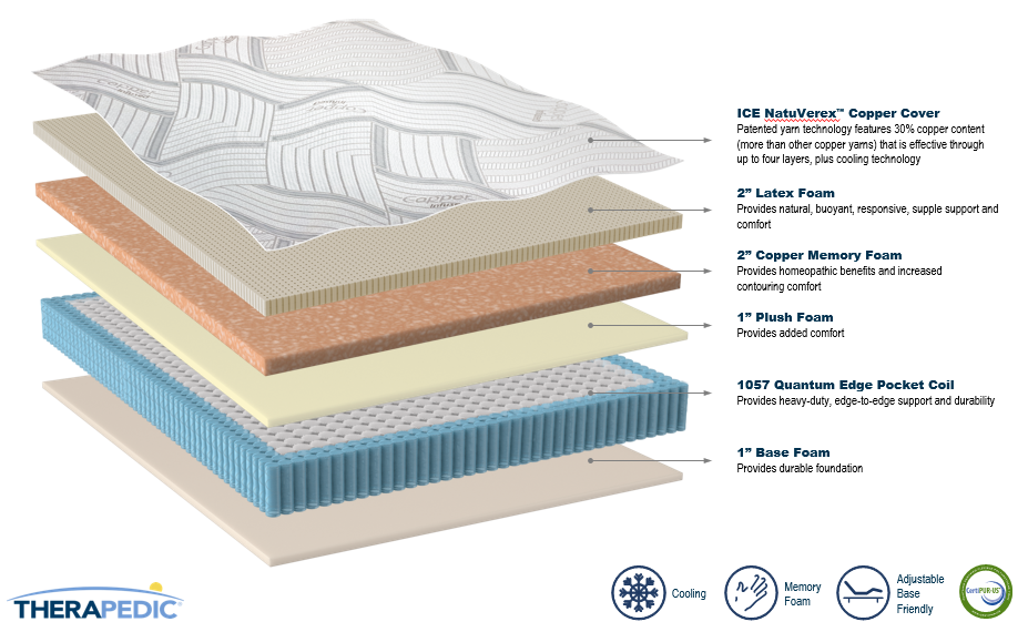 The new Immunity collection from Therapedic provides a selection of high quality mattresses with the health benefits of copper. Naturally anti-bacterial and temperature regulating, copper may also help reduce inflammation and maintain healthy collagen levels. Sleep in peace and comfort on an Immunity mattress.