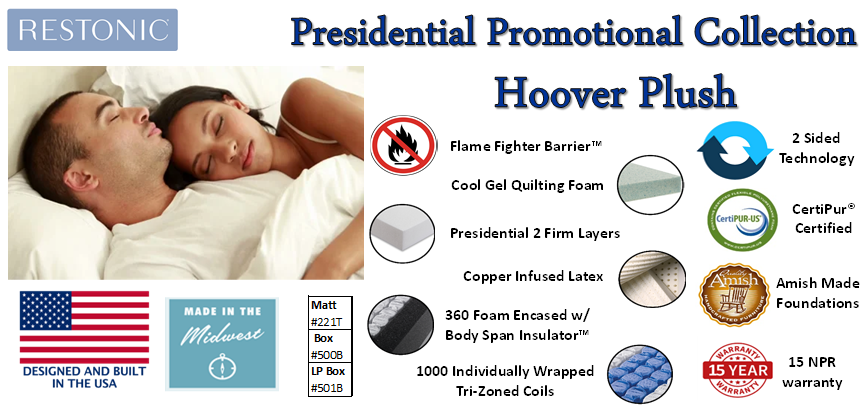 Two-sided value at an affordable price, the Hoover Plush from Spring Air's Presidential collection features individually wrapped coils encased in foam, plus additional layers of copper-infused latex foam and cooling gel quilting foam to keep you comfortable all night long.